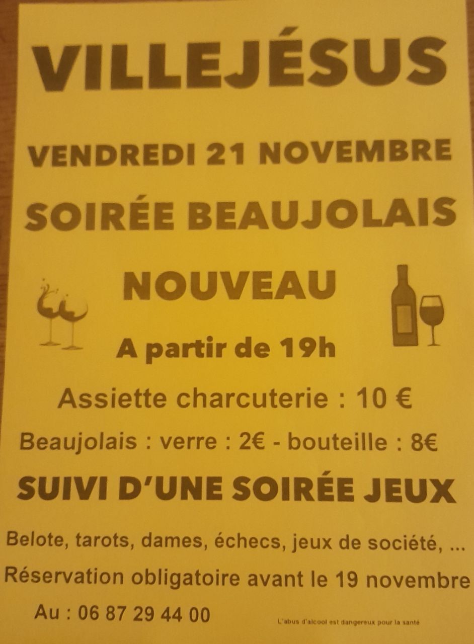 Soirée beaujolais Assiette charcuterie : 10€ beaujolais : verre 2€ - Bouteille : 8 € Suivi d’une soirée jeux Plus d’informations au : 06.87.29.44.00